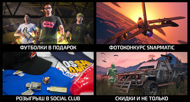 У вас также есть шанс сорвать большой куш, приняв участие в розыгрыше призов в Social Club. Победитель получит набор аксессуаров с символикой GTA V, в том числе черную кепку Merryweather Security, серую футболку Merryweather, футболку Los Santos/San Andreas, USB-накопитель в виде золотого слитка, надувной дирижабль Xero, футболку STD Contractors, кольцо для ключей и хромированную зажигалку Zippo с логотипом GTA V. Чтобы поучаствовать в розыгрыше призов, до 4 сентября оформите заявку на странице мероприятий Social Club.
